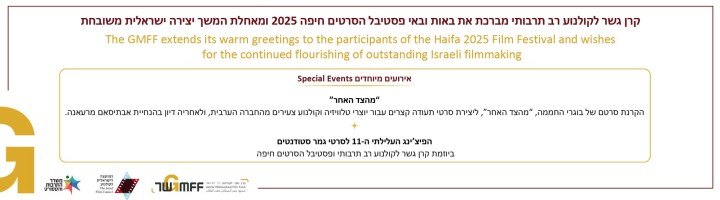 פסטיבל הסרטים הבינלאומי ה-41 חיפה 2025"ברנינג מן" הוא הזוכה בפרס הסרט הישראלי הטוב ביותר בתחרות הקולנוע הישראלי בפסטיבל הסרטים הבינלאומי ה-41 חיפה, 2025 תחרות...